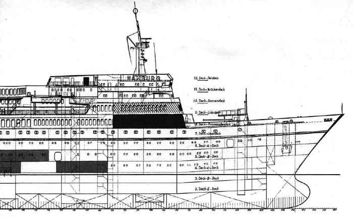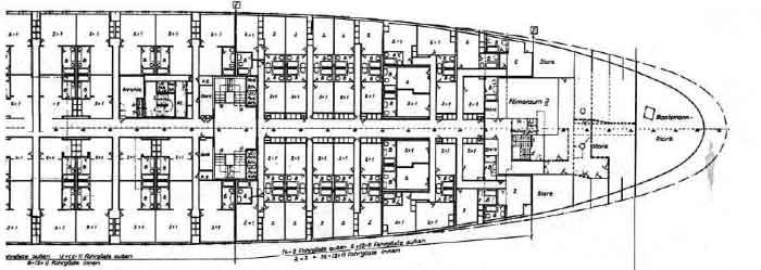 Das 7. Deck (Oberdeck), das ein reines Wohndeck ist, und das 8. Deck (Promenadendeck), das nur Gemeinschaftsräume ent- hält. Sie mögen als Beispiele genügen. Es wird den Fahrgast interessieren, dass allein das Sonnendeck eine Fläche von fast 1000 m2 hat!