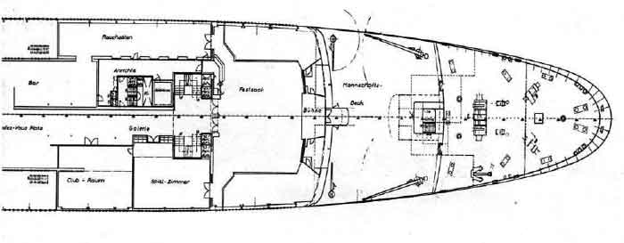 ein Rauchsalon mit 66 m2, ein Rendezvousplatz mit 195m2, ein Klubraum und ein Spielzimmer mit etwa je 100m2. Allein in diesen Räumen könnten zusammen 744 Personen Platz finden. Aber darüber hinaus ist da ja noch die 810m2 große geschlos- sene Promenade und das 320m große freie Deck hinter der selben und noch einmal soviel Raum wie all dies zusammen auf den oberen Decks, - wo auch, immer die vielen Passagiere des hoffentlich stets ausverkauften Schiffes sich aufhalten werden, es ist in jedem Fall reichlich Platz für alle da. Über dem Festsaal