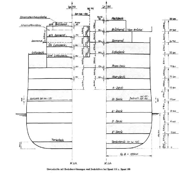 nicht erfasste überschüssige Luft aus den Kammerbereichen wird über Gänge und Treppenhäuser durch Luftausgleichsklappen ins Freie geführt. Es ist hier nicht der Ort, den Leser mit Zahlen zu langweilen, etwa wie viel Luft die einzelnen Räume pro Stunde benötigen (die Gesellschaftsveranda über 11 000, die Speisesäle im C-Deck über 20000m3) — oder mit technischen Details wie solchen, dass z. B. für die automatische Regelung allein 435 thermostatische Raumtemperaturregler