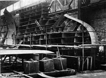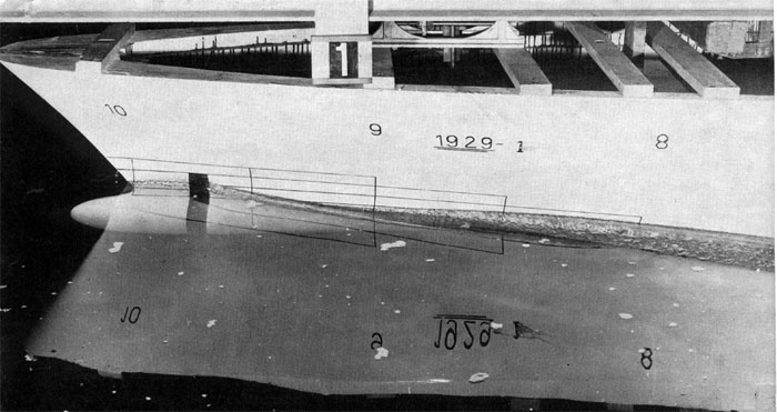 Durch ihn wird ein glatterer Störungsverlauf bewirkt und der Schiffswiderstand erheblich herabgesetzt. Das obige Foto zeigt deutlich das Ergebnis. Wer wollte glauben, dass diese Aufnahme des geschleppten „Hamburg"-Modells im Versuchstank das Wellenbild des Originalschiffes bei 22 Knoten zeigt?! Man darf also aufgrund eingehender wissenschaftlicher Untersuchungen jetzt schon sagen, dass die geforderte Dauerfahrt der „Hamburg", die 23 Knoten betragen soll, bei einem vergleichsweise niedrigen Leistungsaufwand erzielt werden wird, was natürlich für einen rationellen Betrieb des Schiffes von größter Bedeutung ist. Das Foto unten zeigt die Wulstbugsektion in ihrem gegenwärtigen Bauzustand in der Werkstatt.