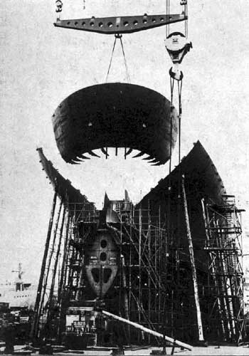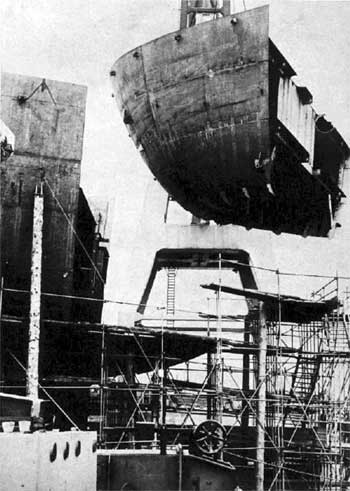 die Lüfte und werden auf der Helling mit dem Schiffskörper verschweißt. Die einzelnen Sektionen