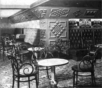 Wand (Galerie, Promenadendeck) und stilvolle, behagliche Sitzecke im Grill-Room (C-Deck). |