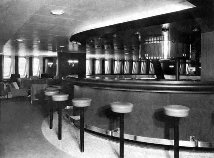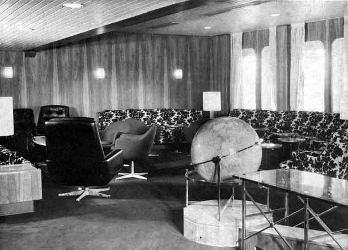 Der Atlantik-Club im Lidodeck mit seiner moosgrünen Zirkelbar (oben) und der Club „Helgoland" im Promenadendeck (unten)
